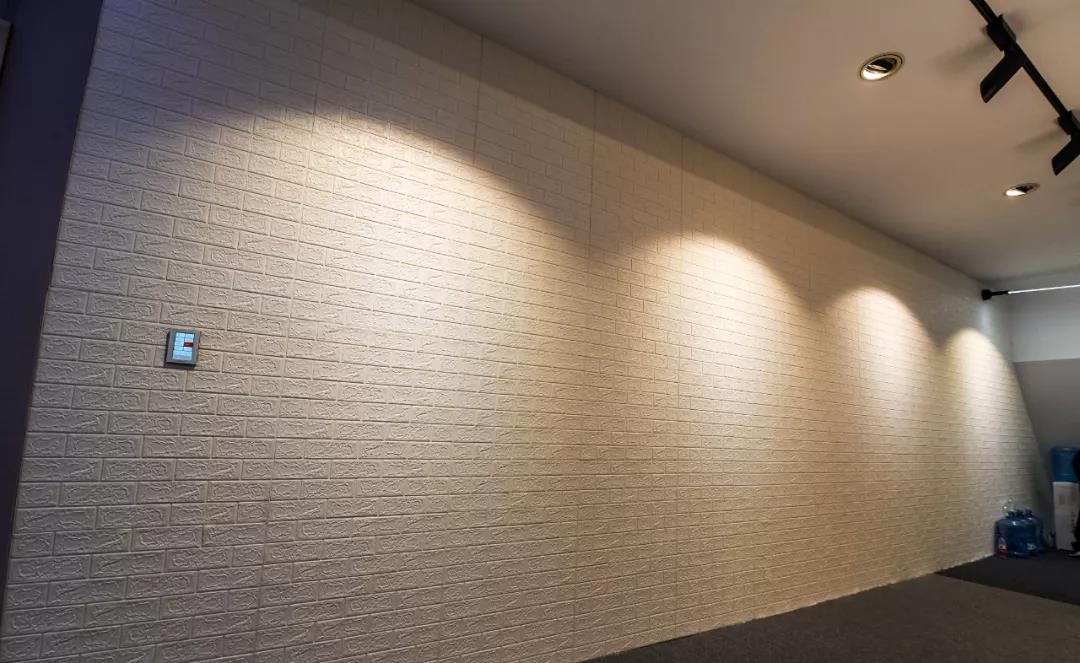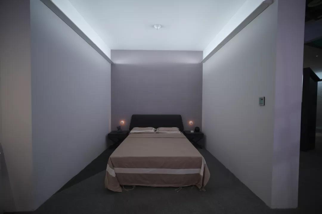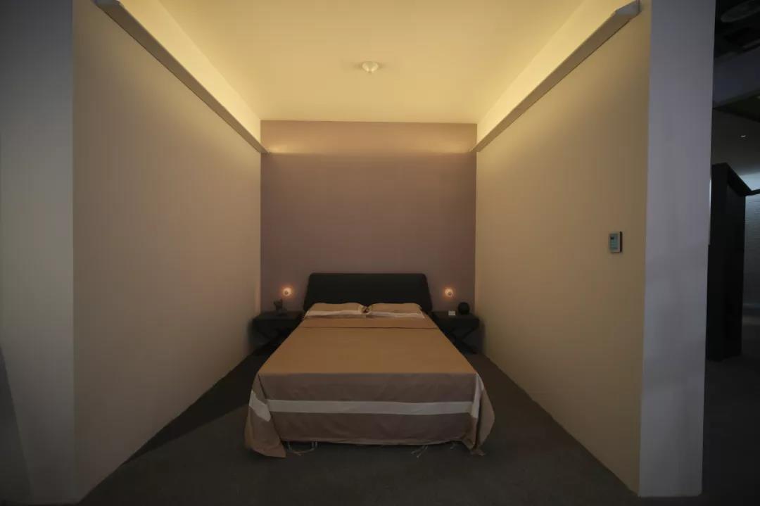 家居空间卧室体验区,用了Geosheen极成壁挂洗顶灯,无需吊顶实现天花板均匀洗亮,此款灯具的设计把灯具的专业技术与装修建材融入一体,实现灯具建材化,节省了装修成本,安装使用方便,多种色温营造多种专业化的光环境氛围。