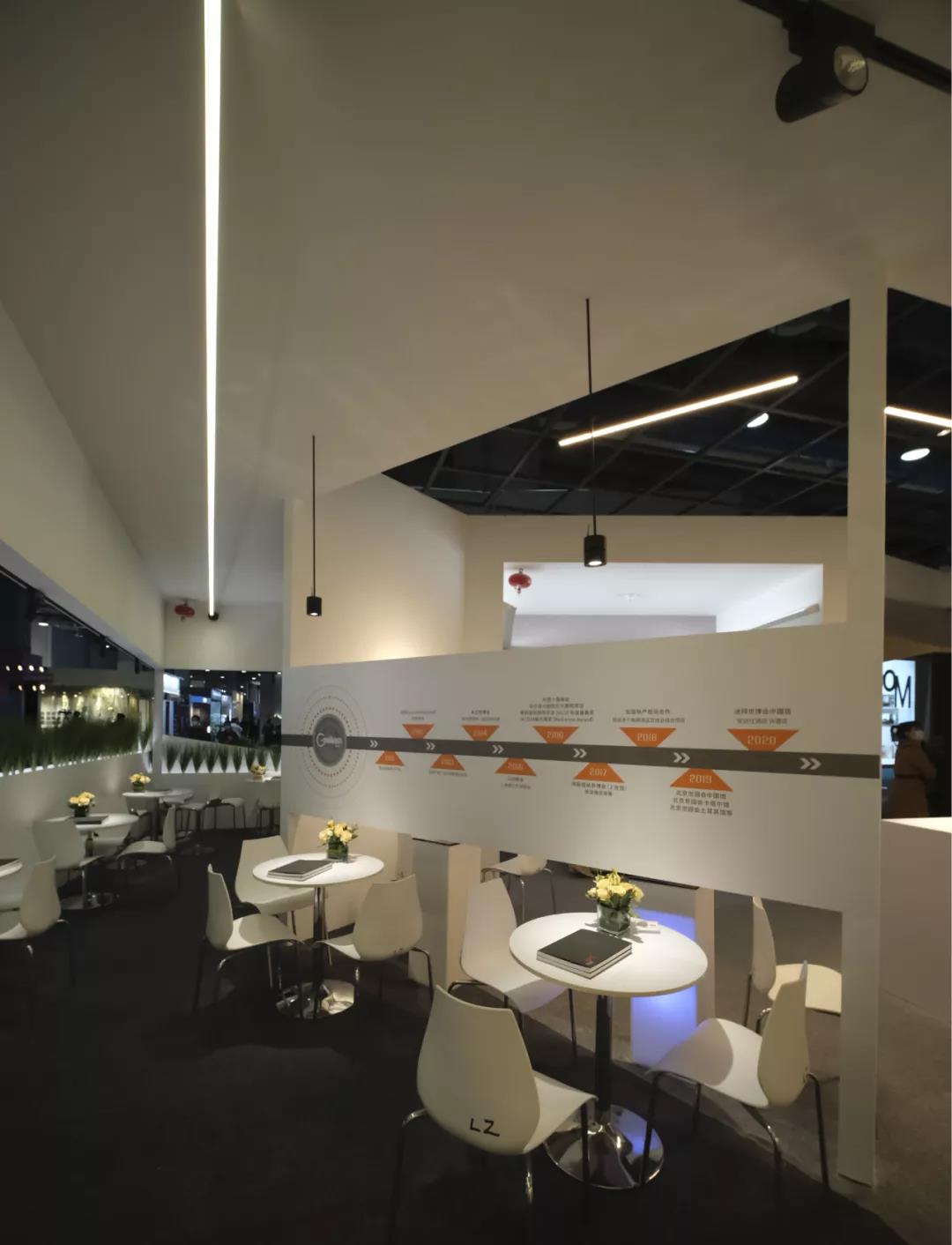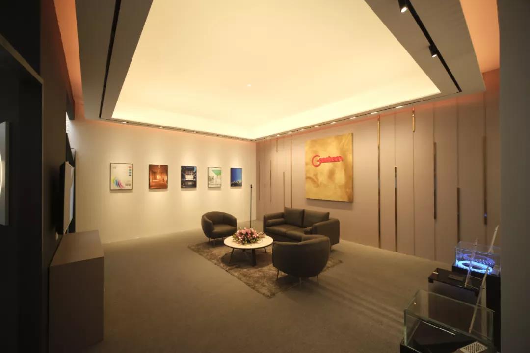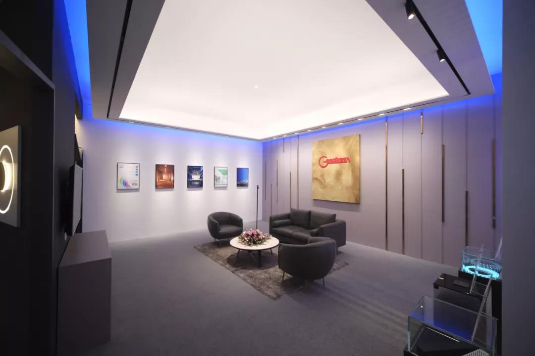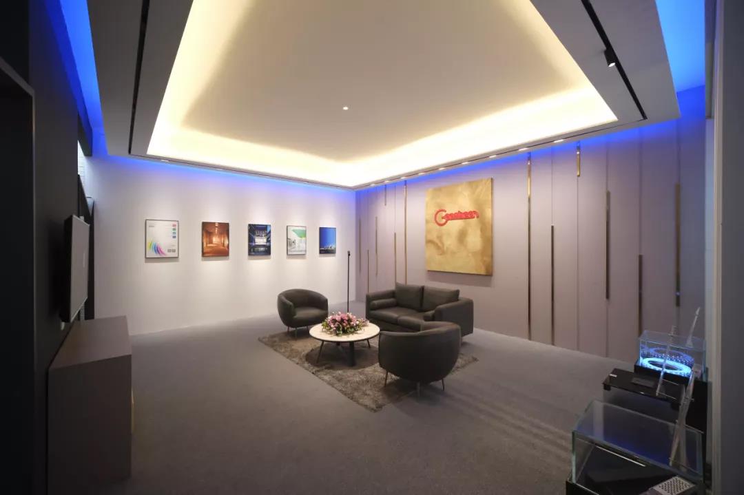 前台区域展示的勾缝灯如闪电般的线条塑造未来语言的造型以及前厅的勾缝灯画框吸引了不是设计师的关注,迷你的尺寸,光线柔和舒适,不刺眼得到众多设计师的好评,该产品有效解决了空间勾缝造型的施工难点,光学专利技术提升了空间的舒适性;