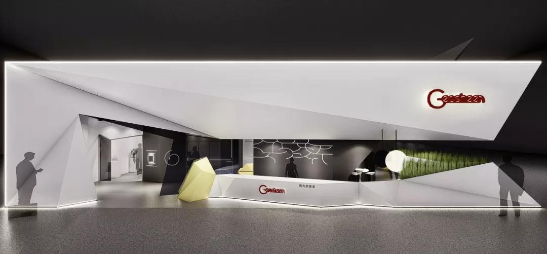 Geosheen极成展厅的设计整体以三角折线为设计主轴,其意念在于呈现犹如闪电般这种线条的曲折变化;外观的造型依照空间功能需求,设计师运用了趣味的呈现方式使整体外观犹如鲨鱼般的一种趣味性。外观造型给人一种具有速度感的视觉理念,蕴含极成品牌的研发和创新的速度快而精准,同时体现Geosheen极成品牌发展速度快、市场定位的精准性。整个空间通过灯光线条的营造一种愉悦舒适的光环境空间氛围。