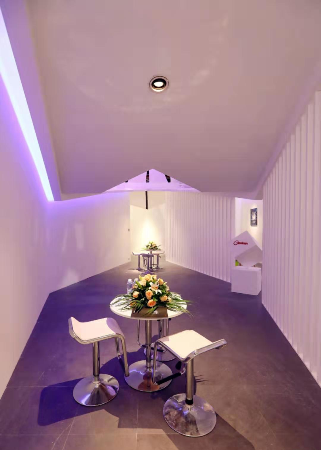会客体验区,展示了洗顶灯,整个天花明亮通透。同常规的硬灯条洗顶效果做了一个对比,让来体验的观众印象深刻。