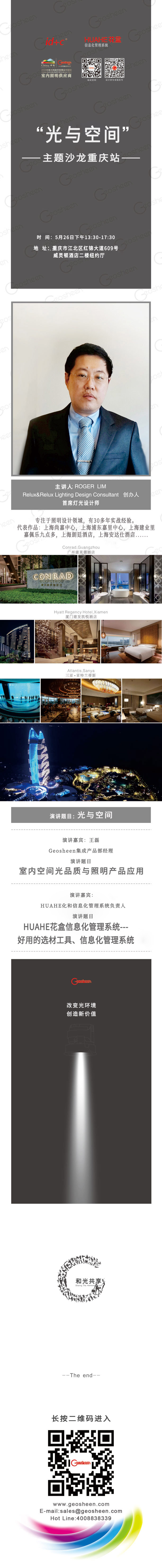 2018年5月26日下午Geosheen极成 在重庆市江北区红棉大道609号威灵顿酒店二楼纽约厅,联合HUAHE花盒信息化管理系统、《id+c室内设计与装修》杂志主办《光与空间》主题设计师沙龙活动。