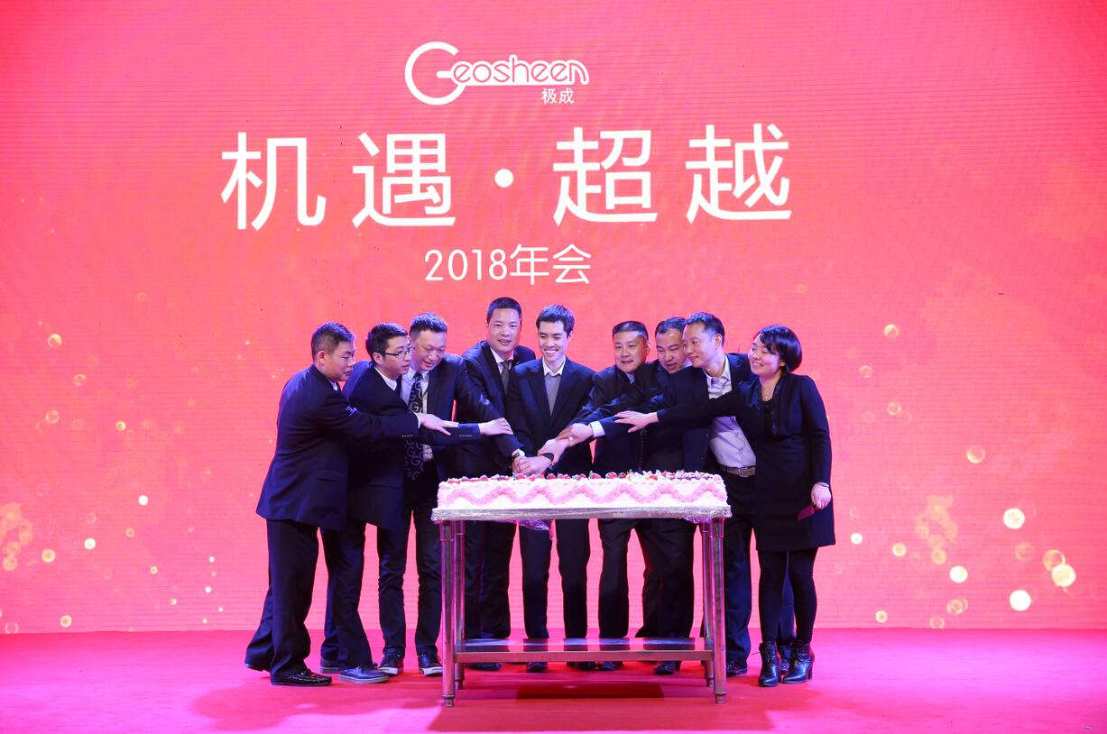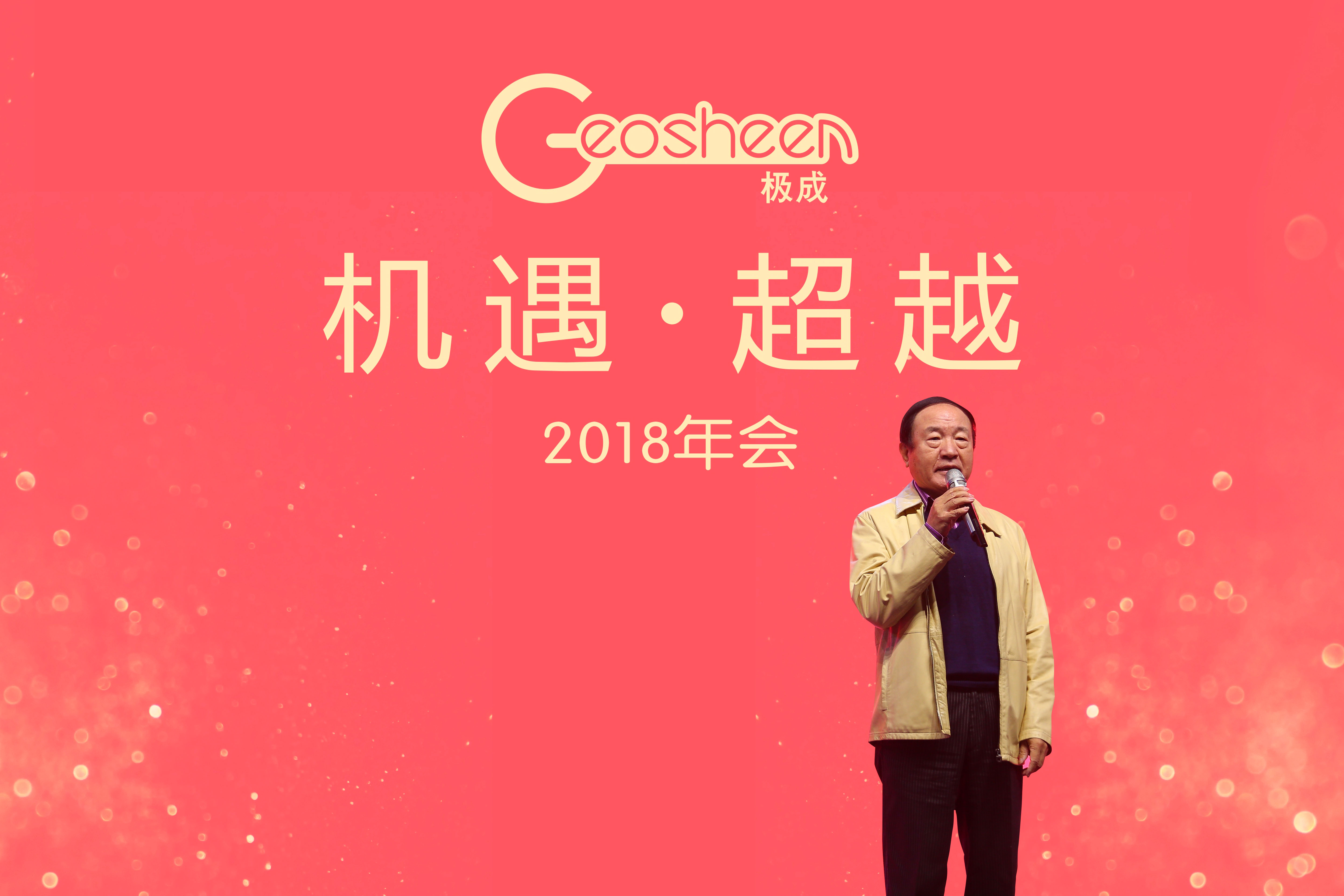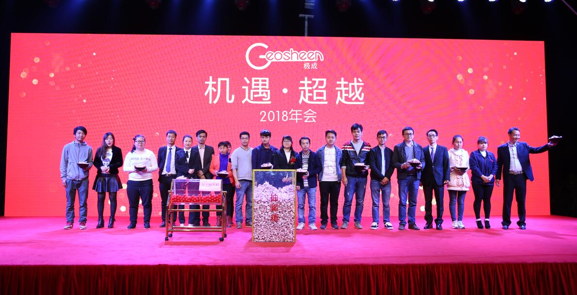 2018年1月23日,以“机遇·超越”为主题迎新庆典晚会在极成工业园隆重举行,此次庆典晚会参加人员除了Geosheen极成全体员工之外,还有政商界代表、合作伙伴、部分经销商代表等约1000人欢聚一堂,共度联欢。
