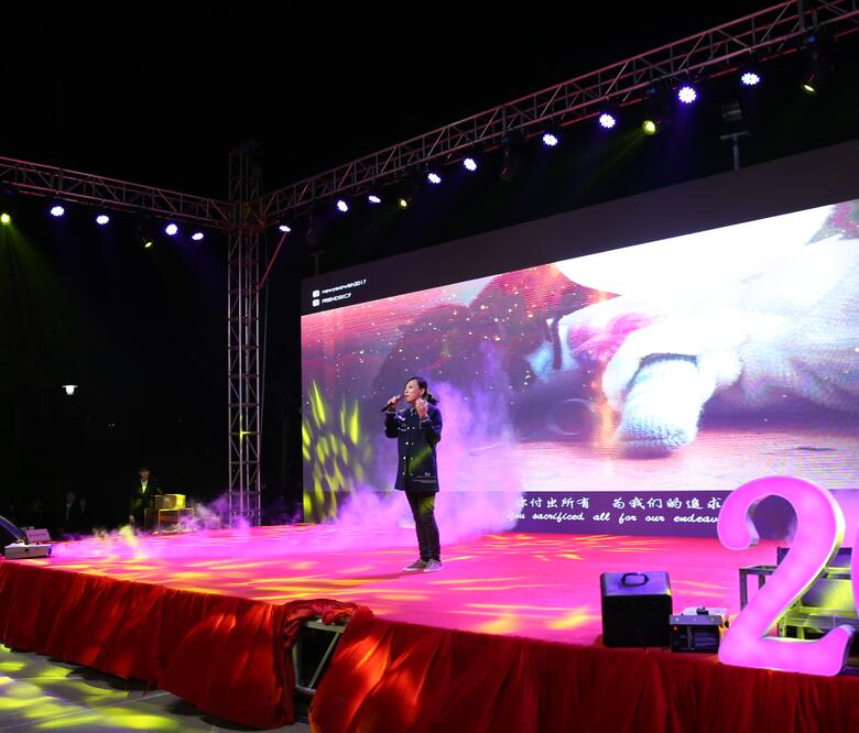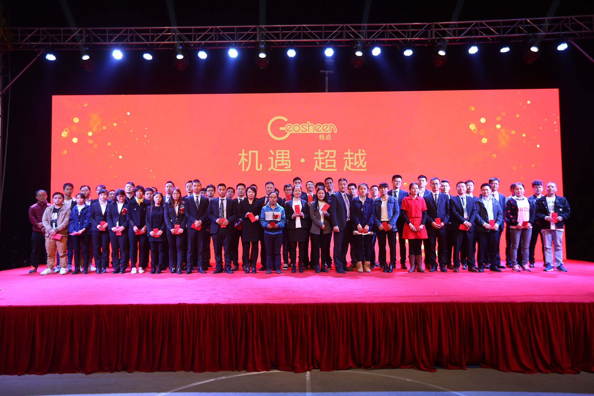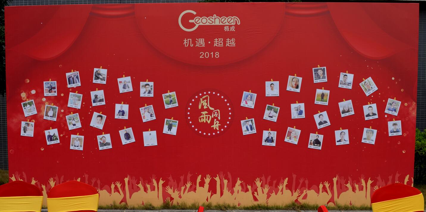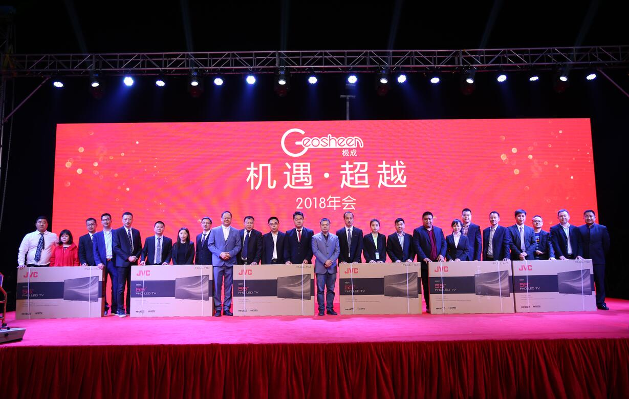 2018年1月23日,以“机遇·超越”为主题迎新庆典晚会在极成工业园隆重举行,此次庆典晚会参加人员除了Geosheen极成全体员工之外,还有政商界代表、合作伙伴、部分经销商代表等约1000人欢聚一堂,共度联欢。