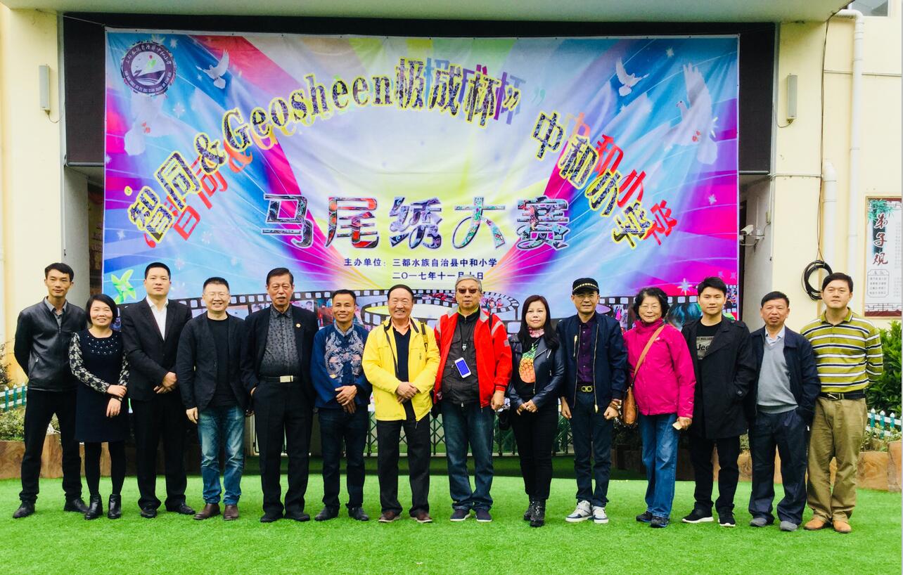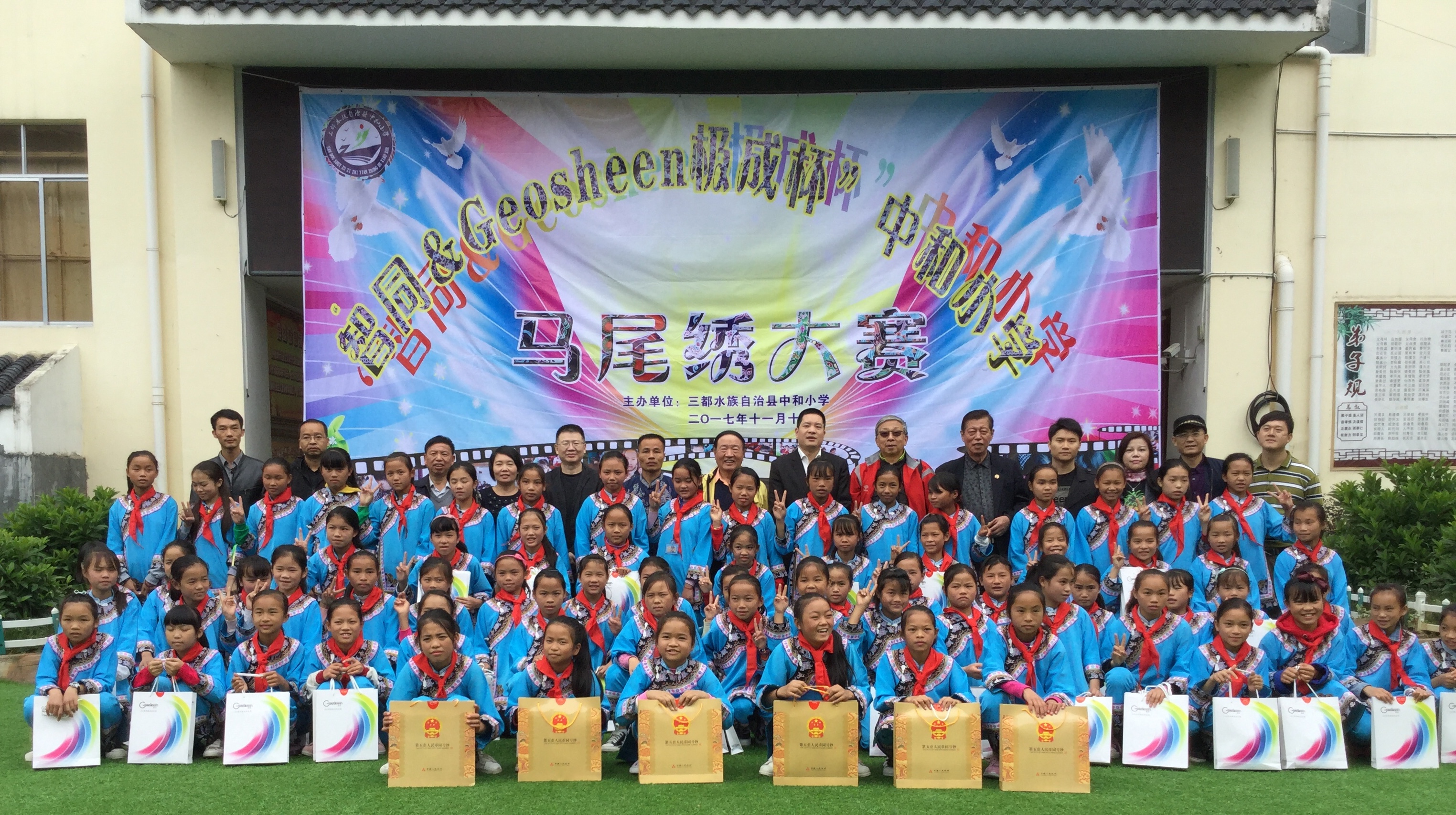2017年11月10日,在三都水族自治县中和小学举办了一场别开生面的 “2017智同·Geosheen极成杯三都中和小学马尾绣大赛” , 本次大赛由深圳商业联合会永久名誉会长、水簇(三都)乡亲会会长庞大同先生和深圳市极成光电有限公司共同主办,并带领部分深圳企业代表来到大赛现场感受水簇的民间传统工艺。