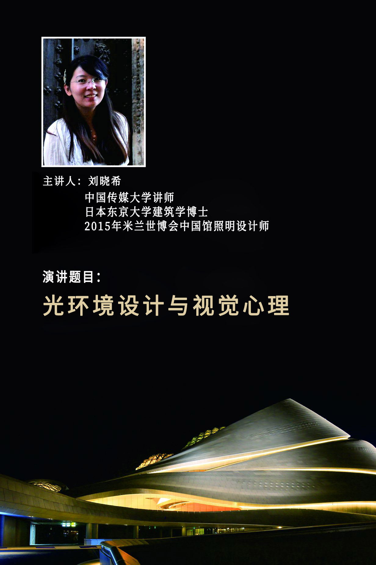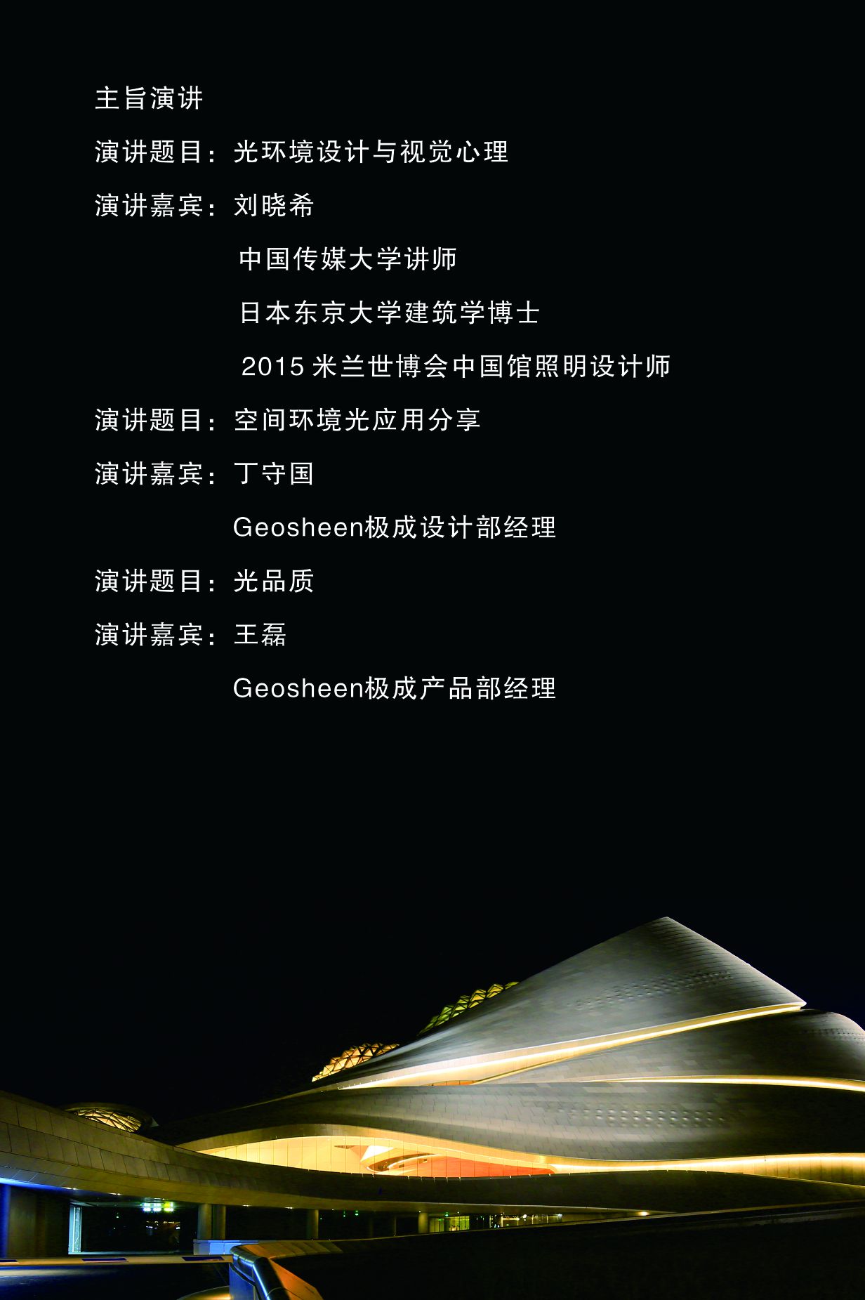 本次沙龙有幸邀请到中国传媒大学讲师,日本东京大学建筑学博士(视觉环境研究),2015米兰世博会 中国馆照明设计师 刘晓希博士与我们分享光环境设计与视觉心理。另外Geosheen极成的设计经理分享“空间环境光应用分享”,产品经理将对“光品质—专业技术解读”进行解读。