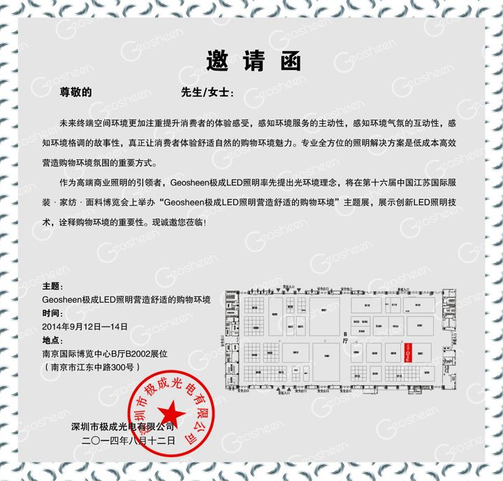 9月12日-14日,为加快推动传统产业转型升级,积极推进江苏纺织服装产业的品牌建设,又一服饰盛宴即将开启,第十六届江苏国际服装节将于南京国际博览中心举办。Geosheen极成LED照明作为LED商业照明领先品牌受邀参展。