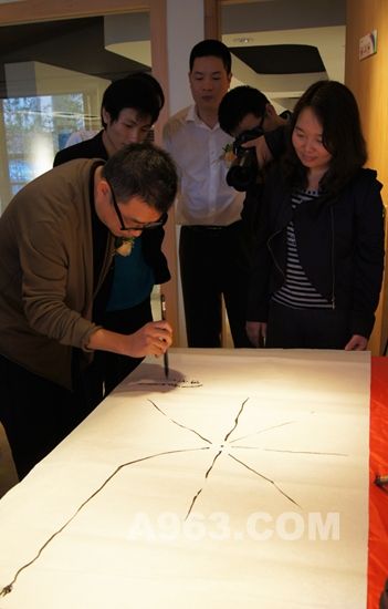 台湾高雄市空间艺术学会理事长曾传杰描绘出“登峰造极”四个大字