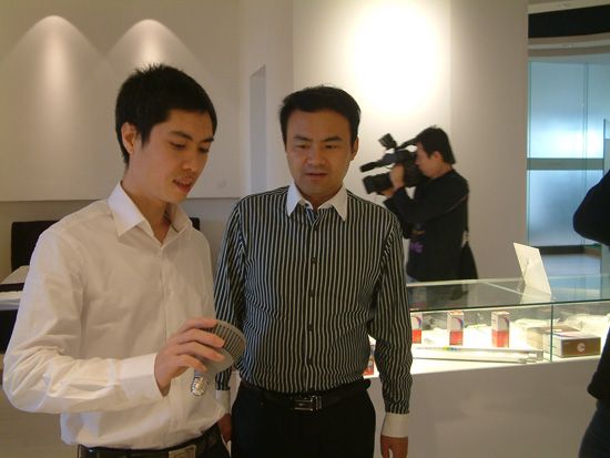 极成光电董事长林陈锋向来访媒体人员介绍极成Geosheen LED照明产品
