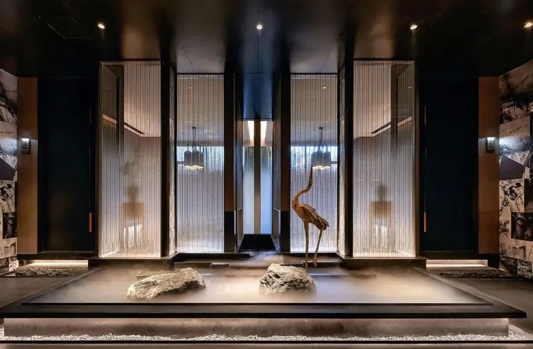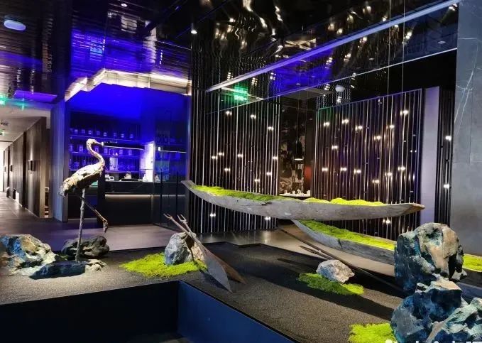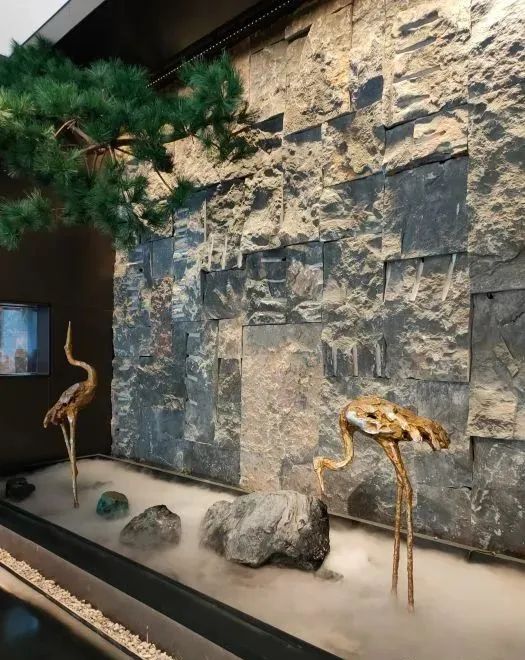 顶上使用嵌入式筒灯做重点照明,暗藏的灯带为辅助照明,两者结合使空间的氛围感一下提升起来,当一束束灯光打在仙鹤上、凹凸的墙壁上,能为顾客打造富有真实感的自然世界。