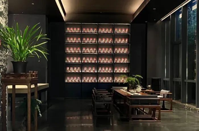 饮茶区在用灯上致力于简约的风格,射灯为茶台、装饰品提供重点照明,暗藏的灯光从里透出,提升空间的层次感和氛围感,明暗之间,让宾客在这里品茶会友,悠然自得。
