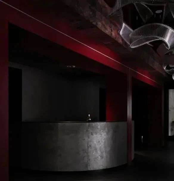 大厅内厚重鲜艳的中式红柱于黯黯处