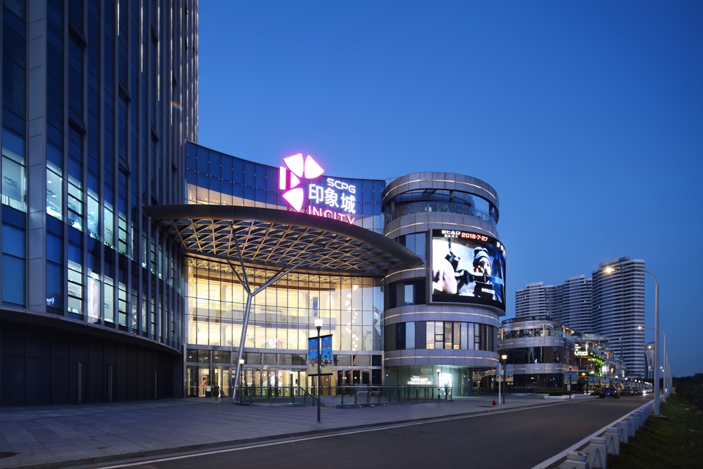 印象城的发光LOGO标志与商场玻璃幕墙内透光是视觉主体。柔和的光线传递一个信息: