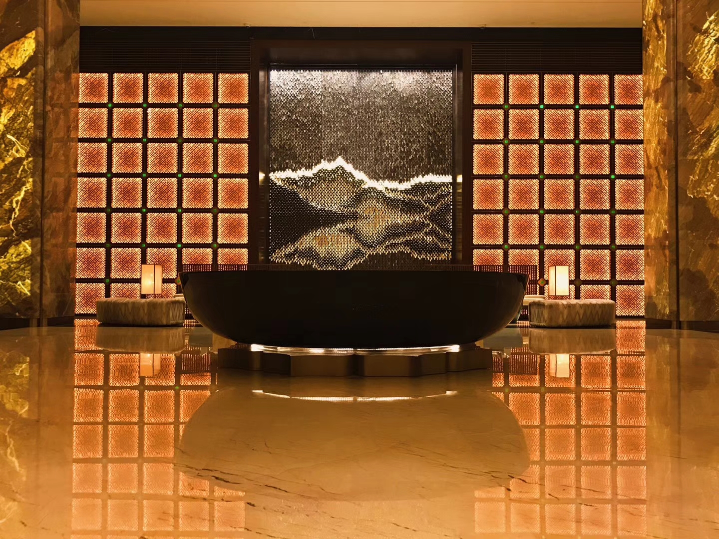 其大堂的硬装与软装杂糅现代美学技艺与中国传统风骨,以江水纹波做基础元素,由此幻化成曲线、莲花、龙腾等意象,大面积应用这些元素以此强调空间调性——落地屏风、柱子饰面、莲花造型吊灯,辅以采用简约的现代线条与技术工艺的家具饰品点缀,且其灯光效果也很恰当地衬托了中国风的设计元素,基础照明控光良好而不滥用灯光,光环境氛围相当友好。这多方的配合,最终让莲花山庄的酒店大堂呈现出现代简约与中式风雅两种美学相融的极致视觉体验。