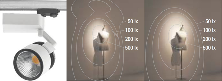 2、精准的光束:左图的展示,有基础、有重点,吸引力强。右图灯具的光束角过大,只有基础照明,没有重点照明,缺乏视觉吸引力。