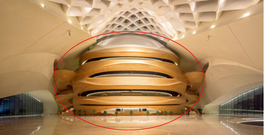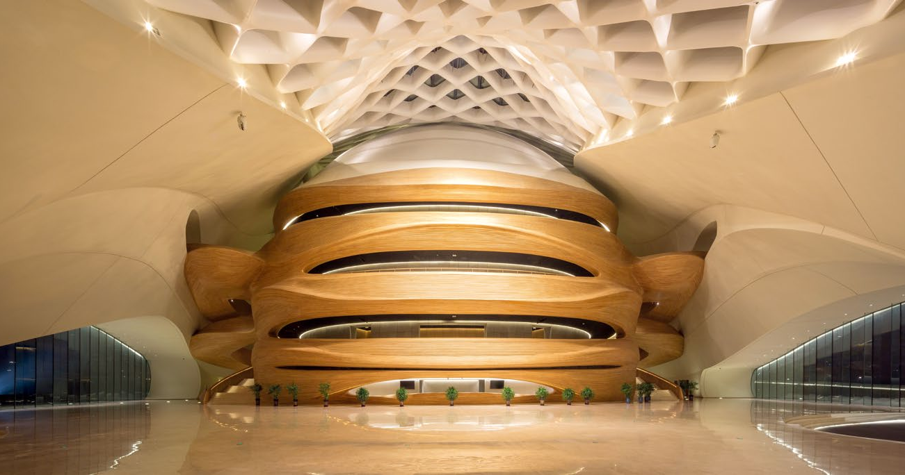 而考虑到材质的灵性与配合剧院本身所需要的声学效果,MAD 团队选择了质感温暖的水曲柳木材,做成环绕大剧场室内外的曲面墙体,兼顾美观性与功能性。