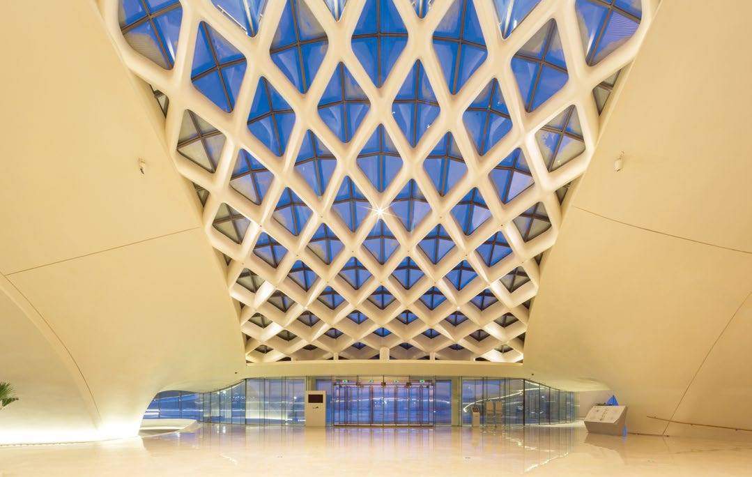 2. 凸起的结构,通过在天窗两侧的 GRC 上安装斗胆灯,向金字塔型龙骨架投光,营造内透效果的同时,提高空间高度感;